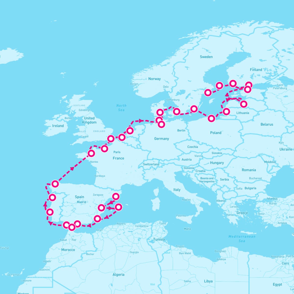 The June 16, 2026 cruise on the Azamara Journey departs from Barcelona, Spain. On this 34 Night Europe: Iberia Northern Europe & Baltic (Barcelona To Stockholm) sailing, the ship will visit a total of 28 cruise port destinations, including its departure port. The Azamara Journey sets sail on Tuesday, Jun 16th and returns on Monday, Jul 20th.