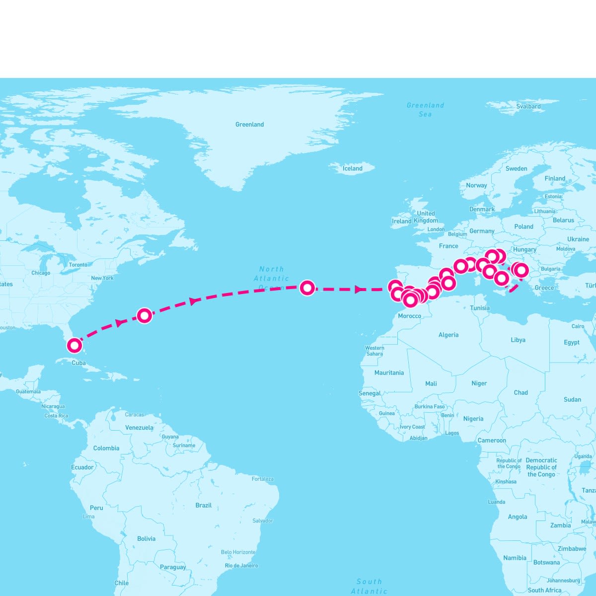 The March 29, 2027 cruise on the Azamara Journey departs from Miami, Florida. On this 37 Night Transatlantic Grand Voyage - Eastbound (Miami To Venice) sailing, the ship will visit a total of 26 cruise port destinations, including its departure port. The Azamara Journey sets sail on Monday, Mar 29th and returns on Wednesday, May 5th.