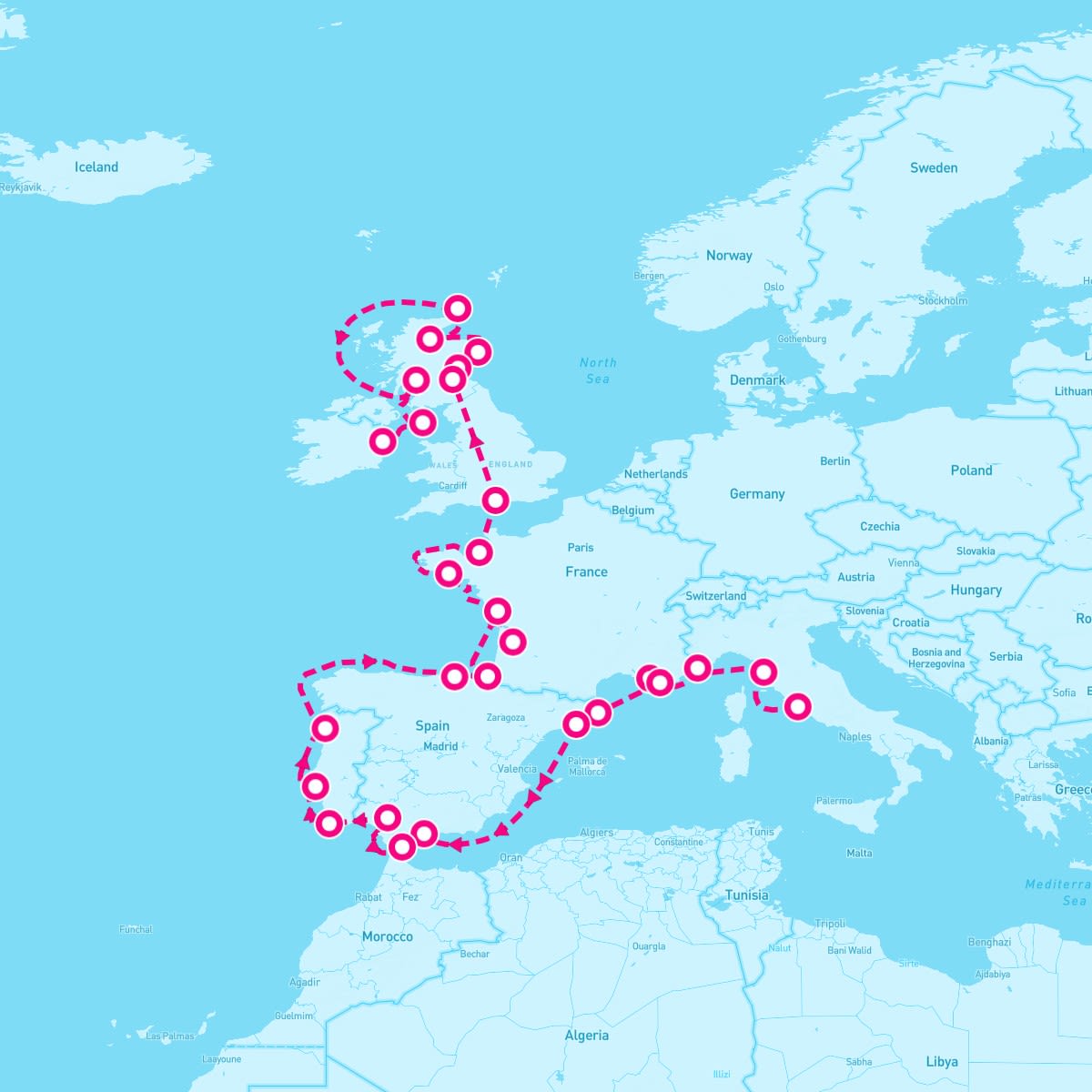 The Azamara Journey sails on May 15, 2027 for a 35 Night Grand Voyage (Rome To Portsmouth). The ship will depart the port of Civitavecchia (Rome), Italy at 6:00 PM and will return to the port of Dublin, Ireland on Jun 19th at 6:00 AM. During the 36-day journey, the Azamara Journey will visit 27 additional ports and will spend 4 days at sea.