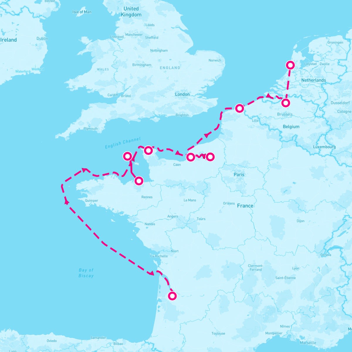 This route includes bordeaux-france, st-peter-port-guernsey-channel-islands, st-malo-france, cherbourg-france, rouen-france, honfleur-france, dunkerque, antwerp-belgium, ijmuiden-amsterdam-netherlands.