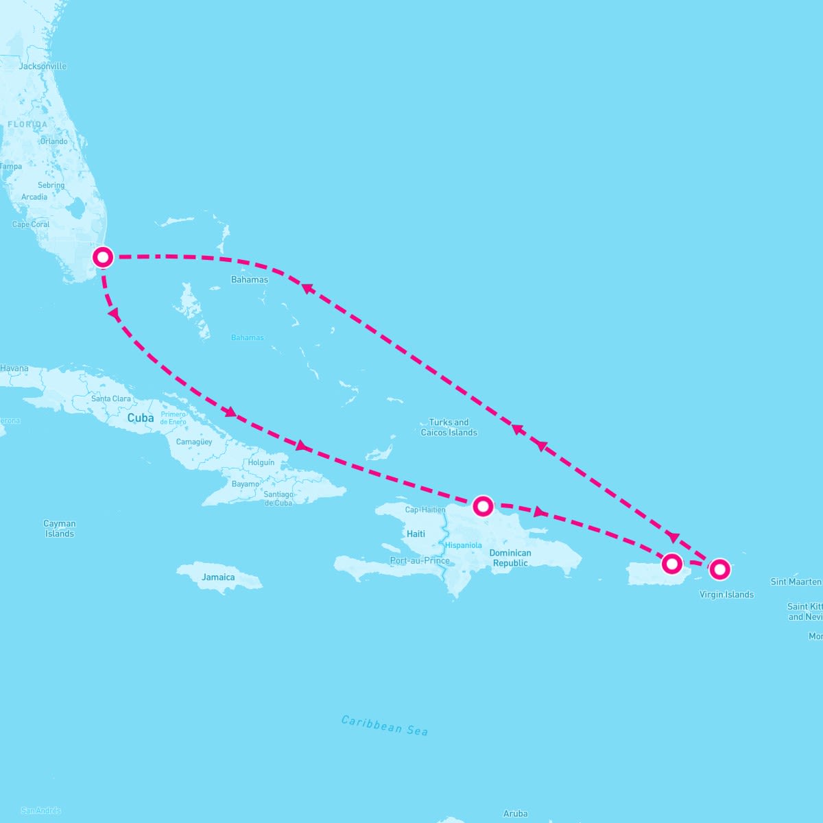 This route includes miami-florida, amber-cove-dominican-republic, san-juan-puerto-rico, charlotte-amalie-st-thomas.