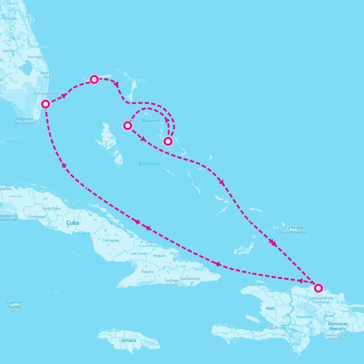 This route includes miami-florida, celebration-key-bahamas, half-moon-cay-bahamas-private-island, nassau-bahamas, amber-cove-dominican-republic.