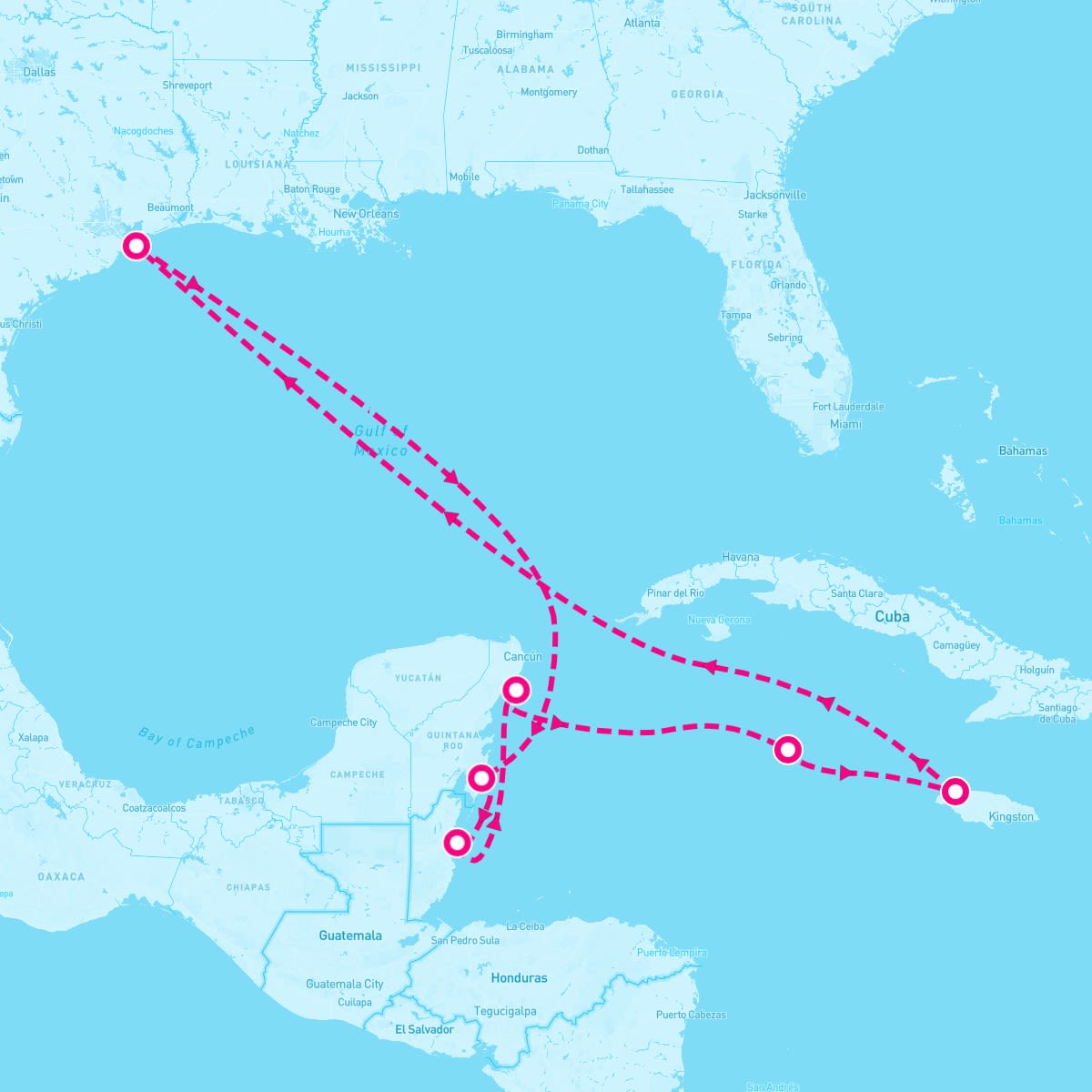 This route includes galveston-texas, costa-maya-mexico, belize-city-belize, cozumel-mexico, george-town-grand-cayman, montego-bay-jamaica.
