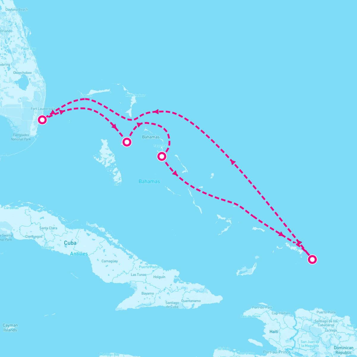 This route includes miami-florida, nassau-bahamas, princess-cays-cruise-line-private-island, grand-turk-turks-caicos.