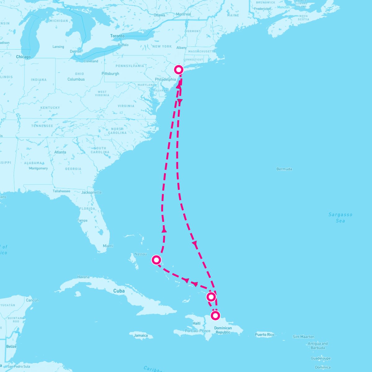 This route includes new-york-new-york, amber-cove-dominican-republic, grand-turk-turks-caicos, half-moon-cay-bahamas-private-island.