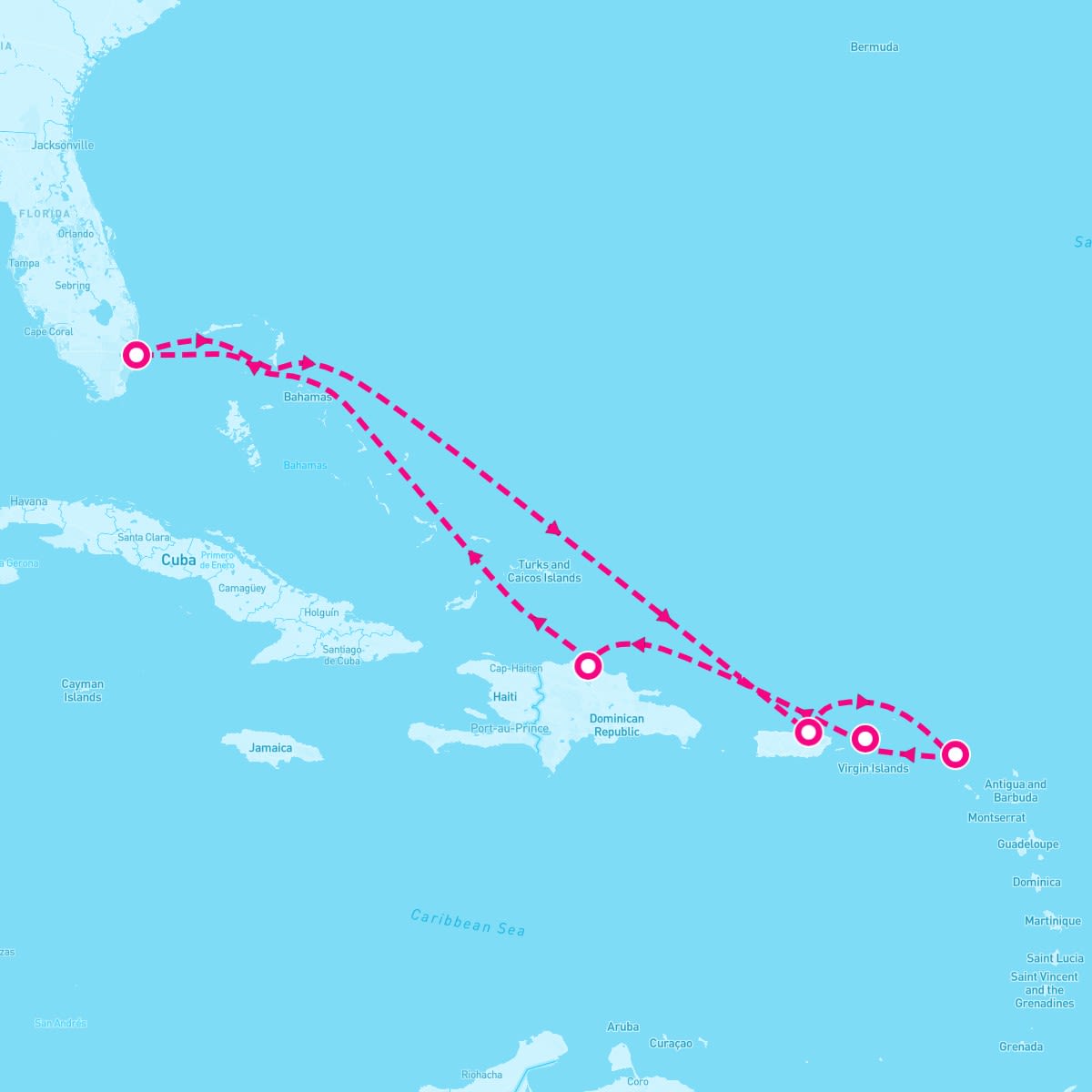 This route includes fort-lauderdale-florida, san-juan-puerto-rico, philipsburg-st-maarten, charlotte-amalie-st-thomas, puerto-plata-dominican-republic.