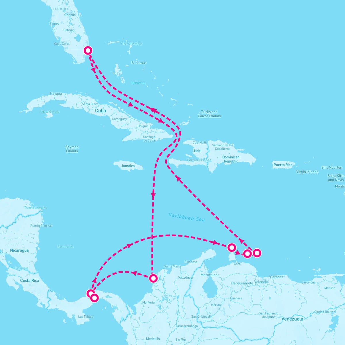 This route includes fort-lauderdale-florida, cartagena-colombia, colon-panama, panama-canal-cruise-into-canal, oranjestad-aruba, willemstad-curacao, kralendijk-bonaire.
