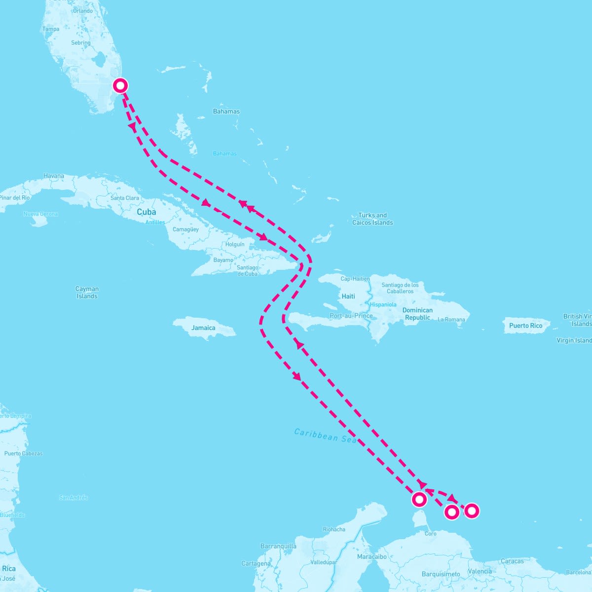 This route includes fort-lauderdale-florida, oranjestad-aruba, kralendijk-bonaire, willemstad-curacao.