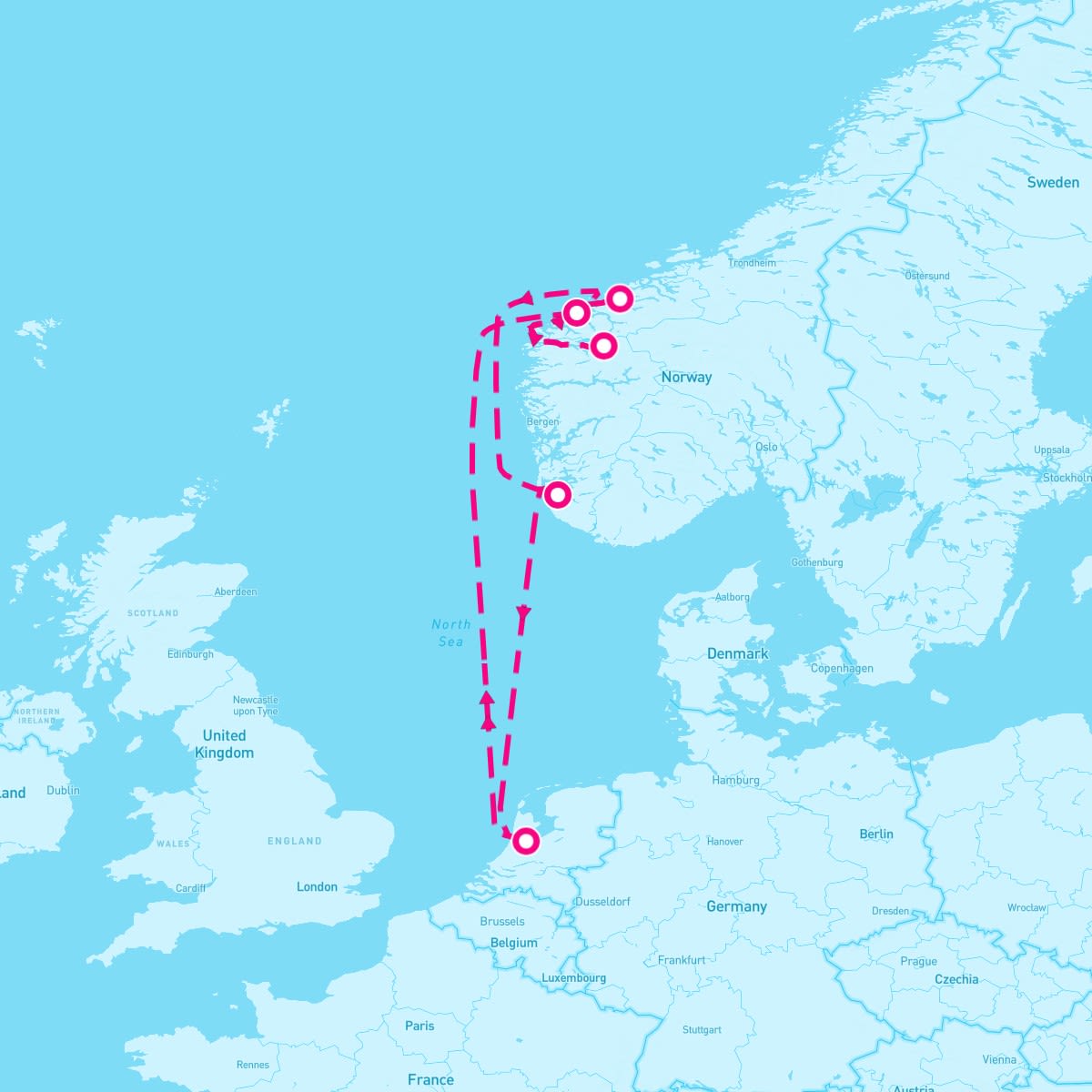 This route includes amsterdam-netherlands, alesund-norway, olden-norway, molde-norway, stavanger-norway.
