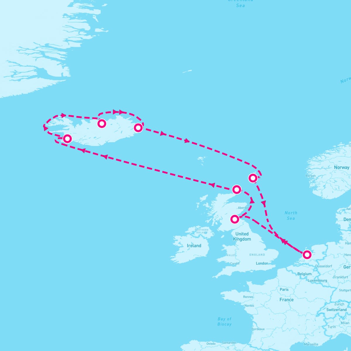 This route includes amsterdam-netherlands, leith-edinburgh-scotland, kirkwall-orkney-islands-scotland, reykjavik-iceland, akureyri-iceland, seydisfjordur-iceland, lerwick-shetland-islands-scotland.
