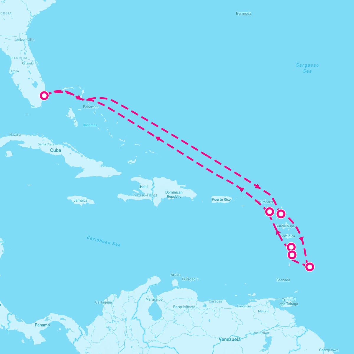 This route includes fort-lauderdale-florida, st-johns-antigua, bridgetown-barbados, castries-st-lucia, fort-de-france-martinique, basseterre-st-kitts.