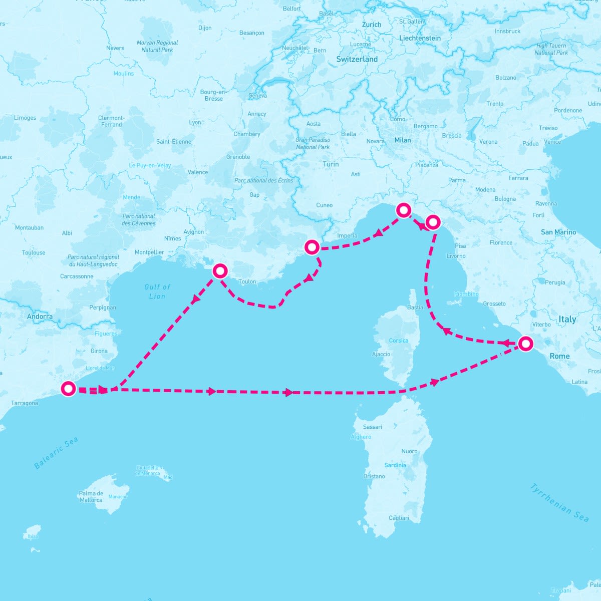 This route includes barcelona-spain, rome-italy, la-spezia-italy, portofino-italy, nice-france, marseille-france.