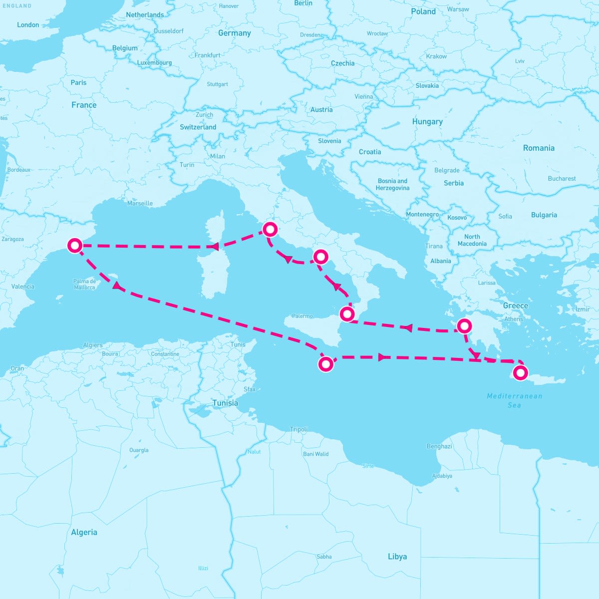 This route includes barcelona-spain, valletta-malta, souda-chania-crete, olympia-greece, messina-sicily, naples-italy, rome-italy.