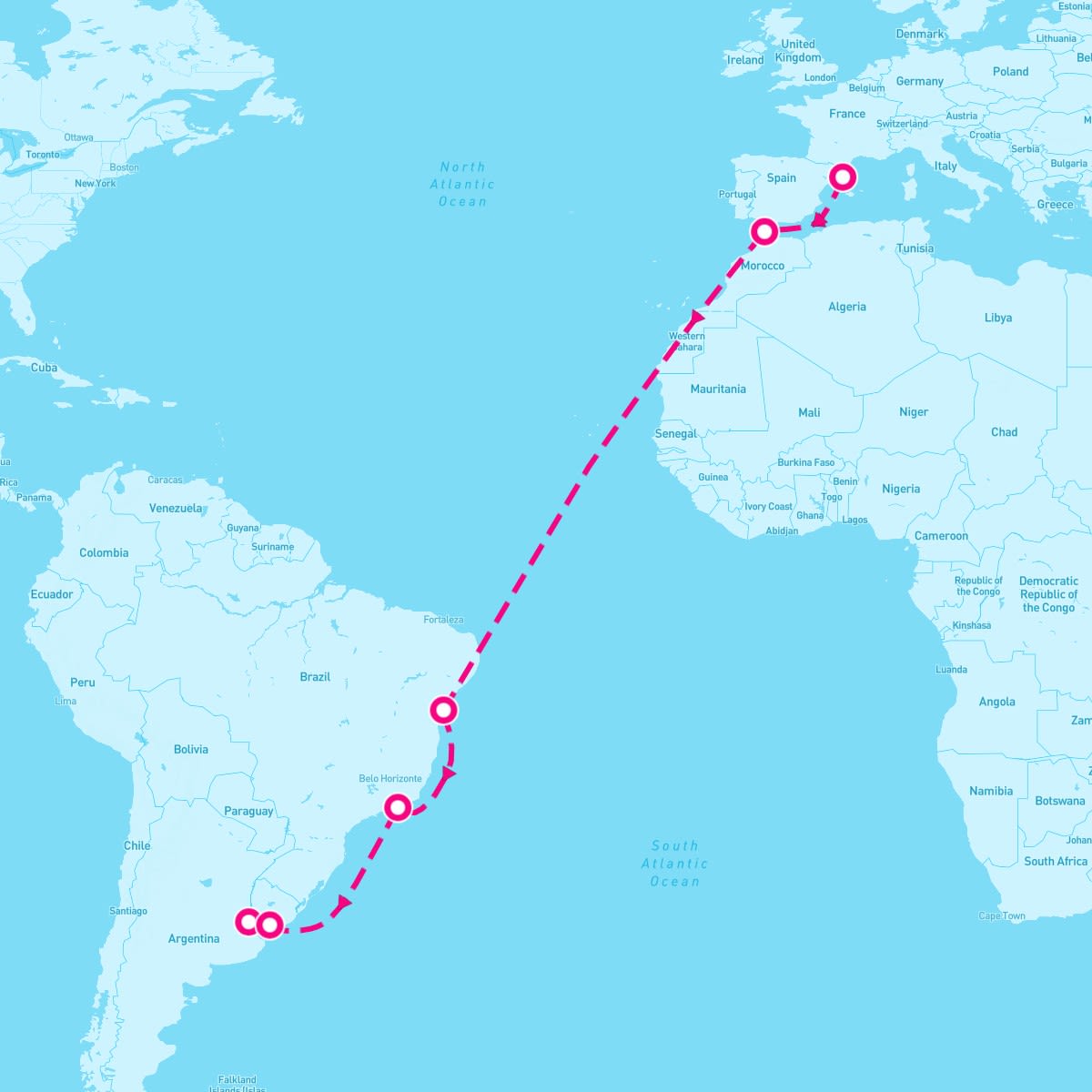 This route includes barcelona-spain, tangier-morocco, salvador-de-bahia-brazil, rio-de-janeiro-brazil, montevideo-uruguay, buenos-aires-argentina.