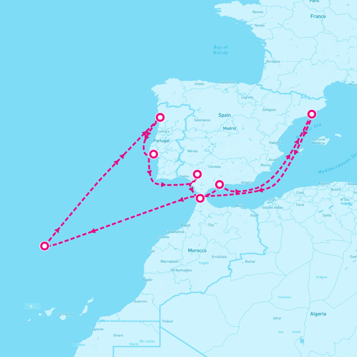 This route includes barcelona-spain, tangier-morocco, funchal-madeira, porto-portugal, lisbon-portugal, seville-spain, malaga-spain.