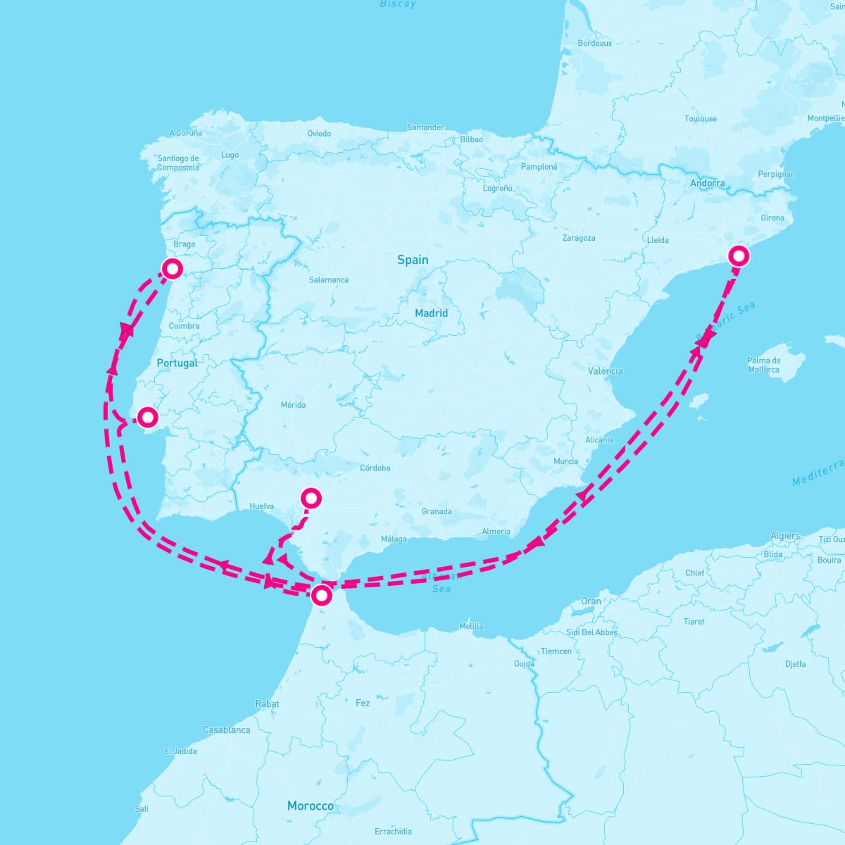 This route includes barcelona-spain, lisbon-portugal, porto-portugal, tangier-morocco, seville-spain.