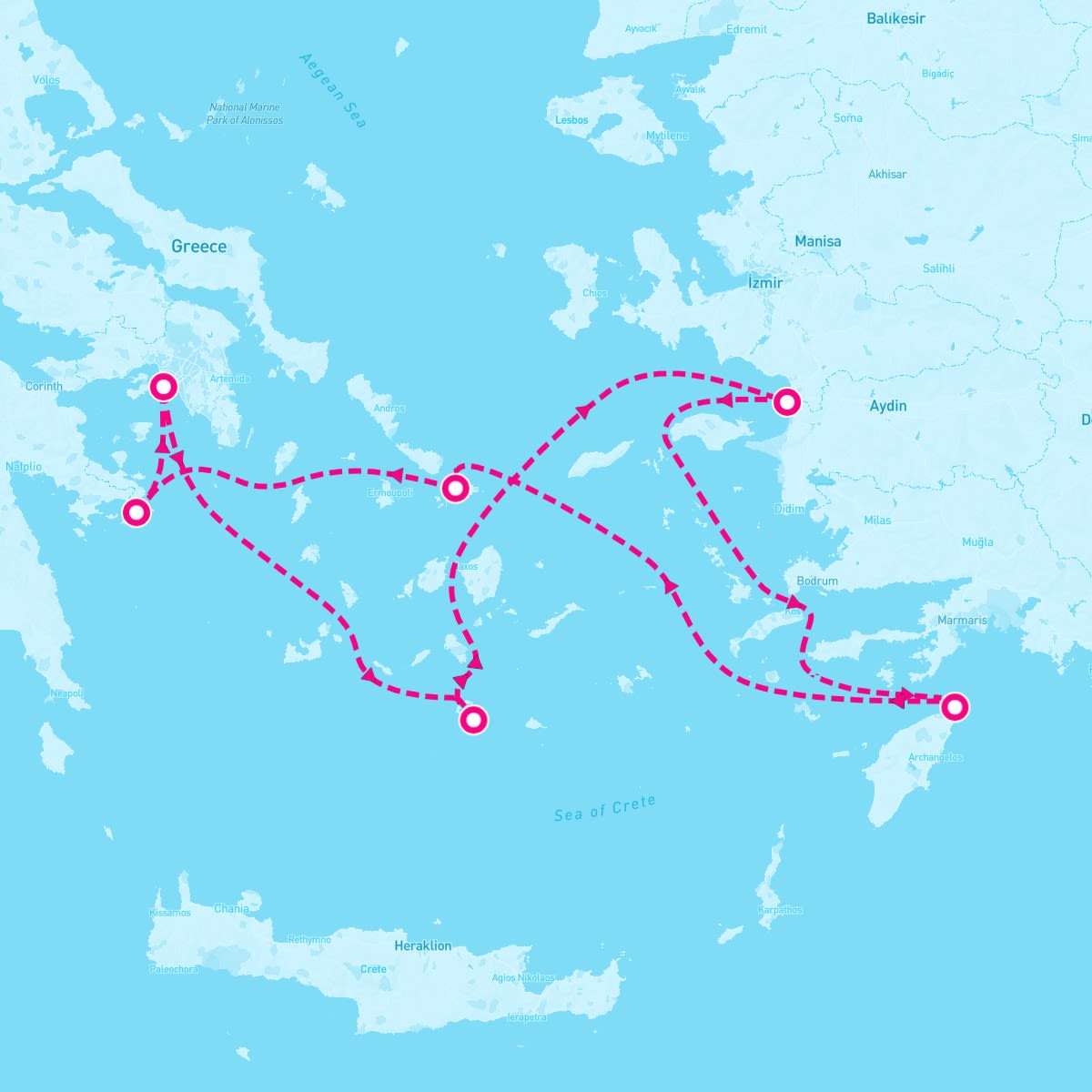 This route includes athens-greece, santorini-greece, kusadasi-turkey, rhodes-greece, mykonos-greece, hydra-greece.