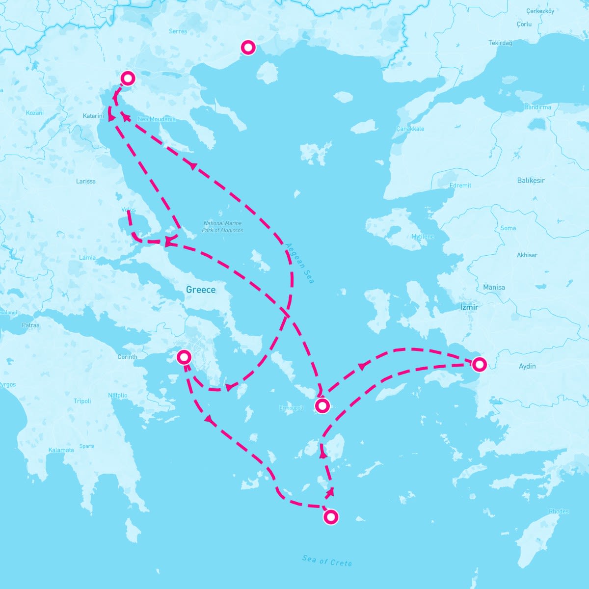 This route includes athens-greece, santorini-greece, thessaloniki-greece, kavala-greece, kusadasi-turkey, mykonos-greece.