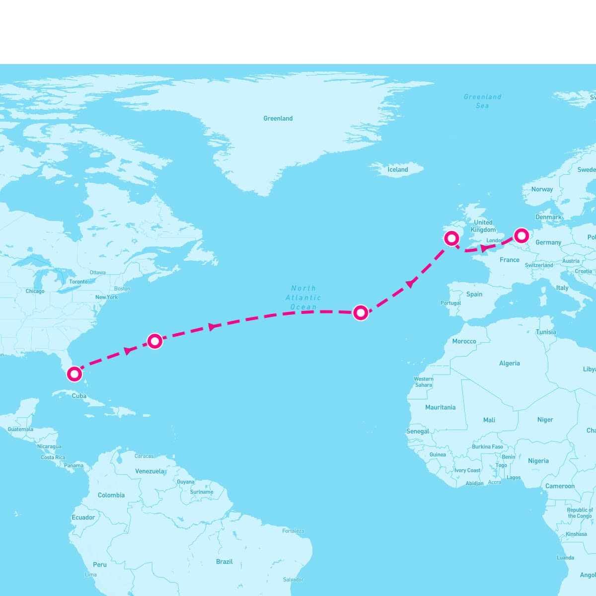 This route includes fort-lauderdale-florida, royal-naval-dockyard-west-end-bermuda, ponta-delgada-azores, cork-ireland, amsterdam-netherlands.