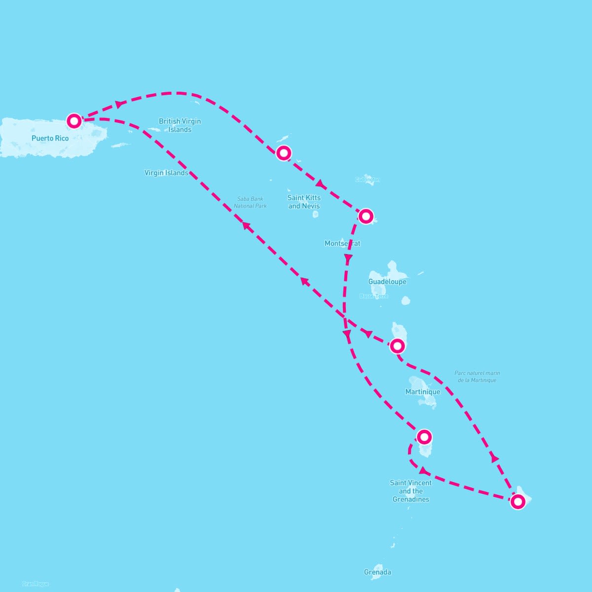 This route includes san-juan-puerto-rico, philipsburg-st-maarten, st-johns-antigua, castries-st-lucia, bridgetown-barbados, roseau-dominica.