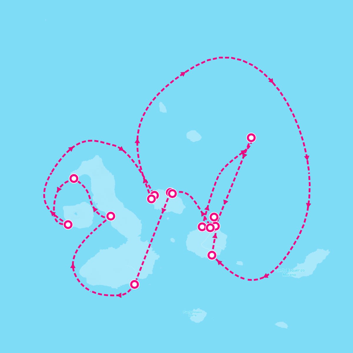 This route includes black-turtle-cove-santa-cruz-galapagos, baltra-galapagos, sullivan-bay-santiago-galapagos, bartolome-island-san-salvador-galapagos, caleta-tagus-isabela-galapagos, urbina-bay-isabela-galapagos, punta-vicente-roca-isabela-galapagos, punta-espinoza-fernandina-galapagos, playa-espumilla-santiago-galapagos, puerto-egas-san-salvador-galapagos, puerto-ayora-santa-cruz-galapagos, el-barranco-genovesa-galapagos, bahia-darwin-genovesa-galapagos, north-seymour-galapagos.