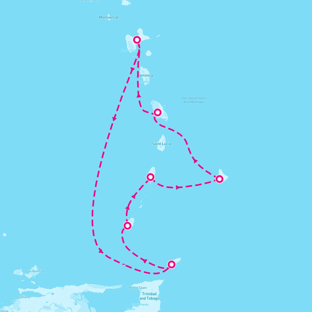 This route includes fort-de-france-martinique, pointe-a-pitre-guadeloupe, scarborough-tobago, st-georges-grenada, kingstown-st-vincent, bridgetown-barbados.