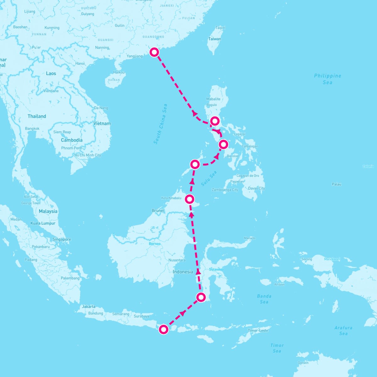 This route includes bali-indonesia, makassar-sulawesi-indonesia, sandakan-malaysia, puerto-princesa-philippines, boracay-philippines, manila-philippines, hong-kong-china.
