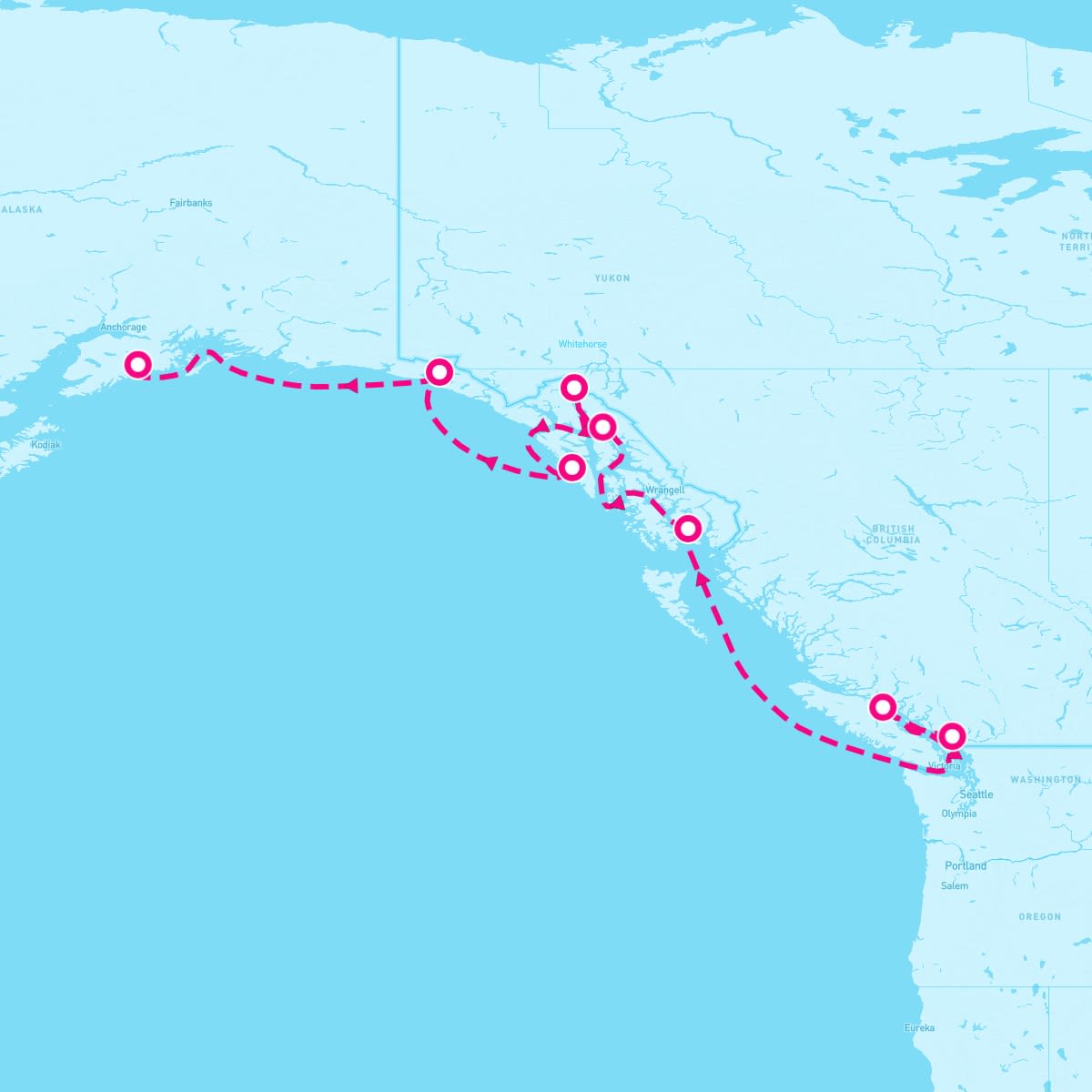 This route includes vancouver-british-columbia, seymour-narrows-british-columbia, ketchikan-alaska, juneau-alaska, skagway-alaska, sitka-alaska, cruise-hubbard-glacier, seward-anchorage-alaska.