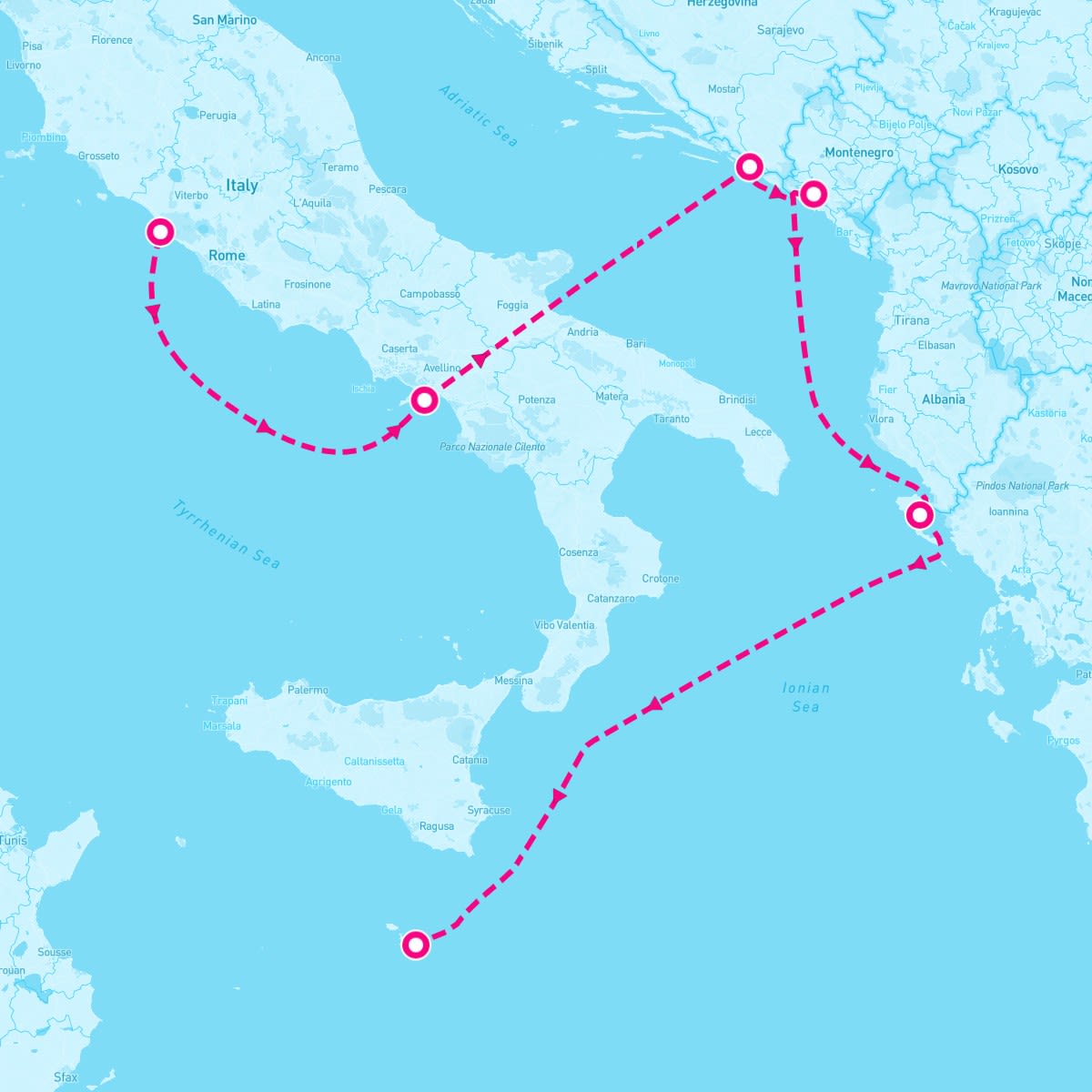 This route includes rome-italy, amalfi-italy, dubrovnik-croatia, kotor-montenegro, corfu-greece, valletta-malta.