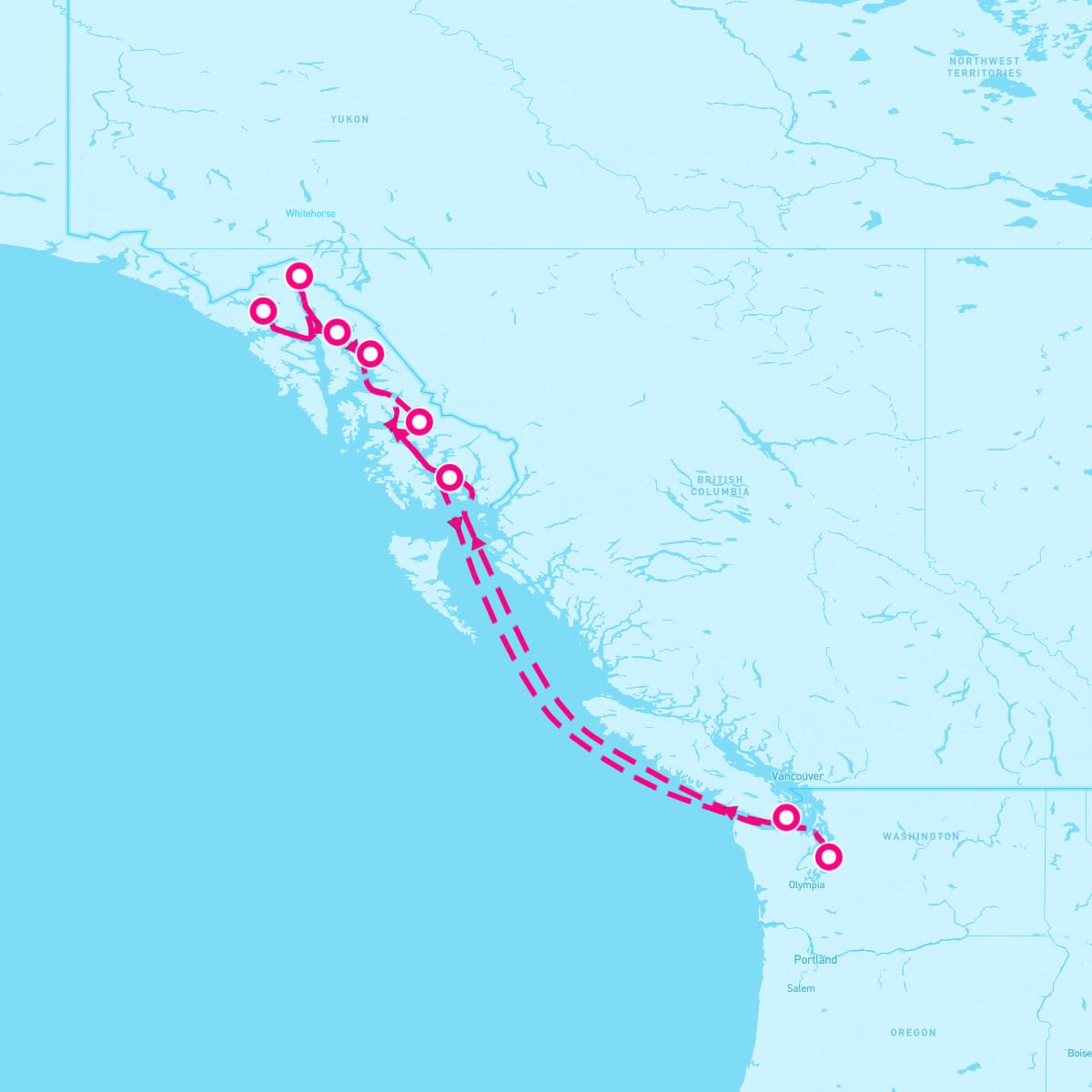 This route includes seattle-washington, ketchikan-alaska, cruise-tracy-arm-fjord-alaska, juneau-alaska, skagway-alaska, cruise-glacier-bay, wrangell-alaska, victoria-british-columbia.