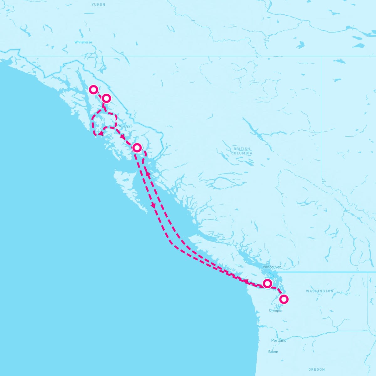 This route includes seattle-washington, ketchikan-alaska, juneau-alaska, cruise-tracy-arm-fjord-alaska, victoria-british-columbia.