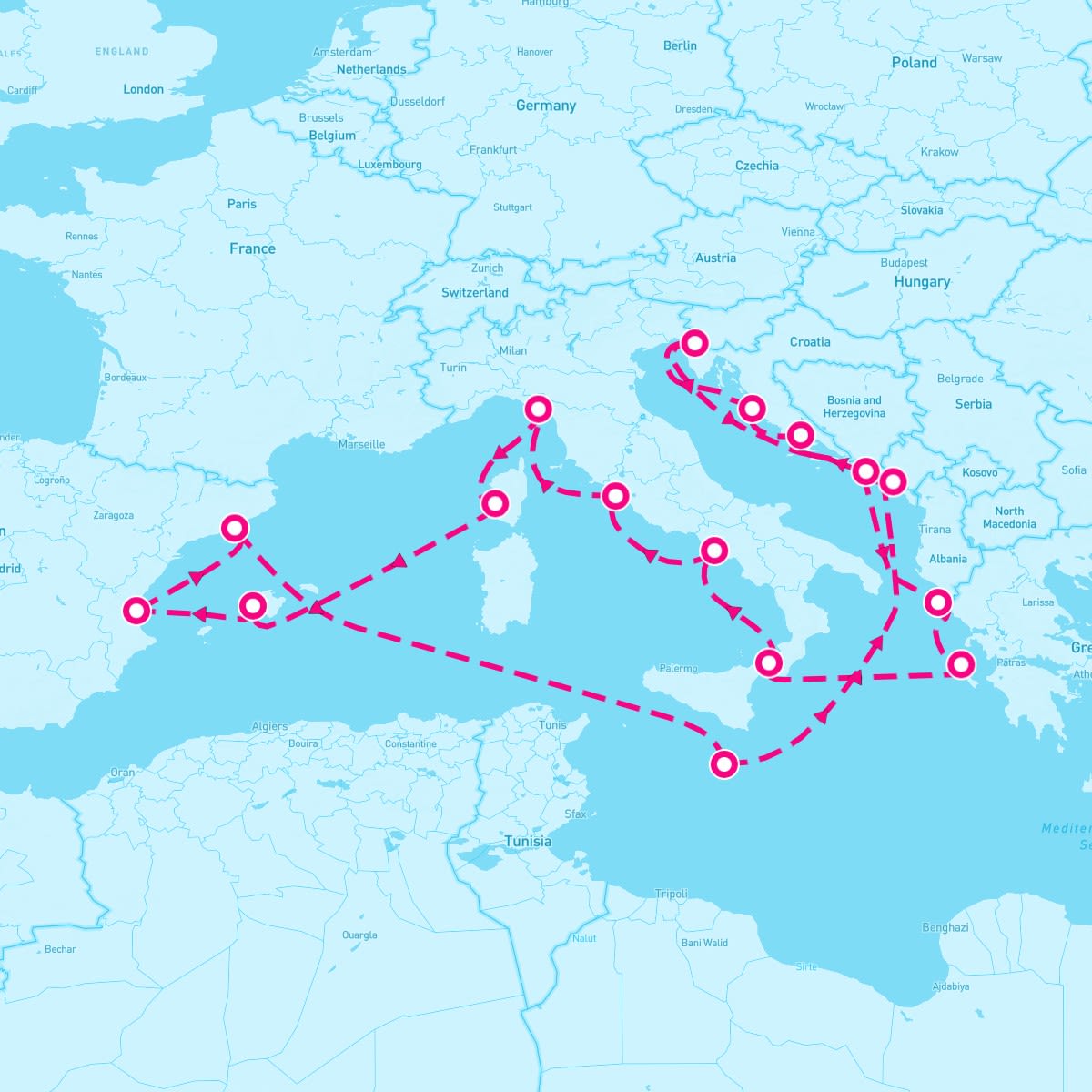 This route includes trieste-italy, dubrovnik-croatia, corfu-greece, cephalonia-greek-isle, cruise-strait-of-messina, naples-italy, rome-italy, la-spezia-italy, ajaccio-corsica, palma-de-mallorca-spain, valencia-spain, barcelona-spain, valletta-malta, kotor-montenegro, split-croatia, zadar-croatia.
