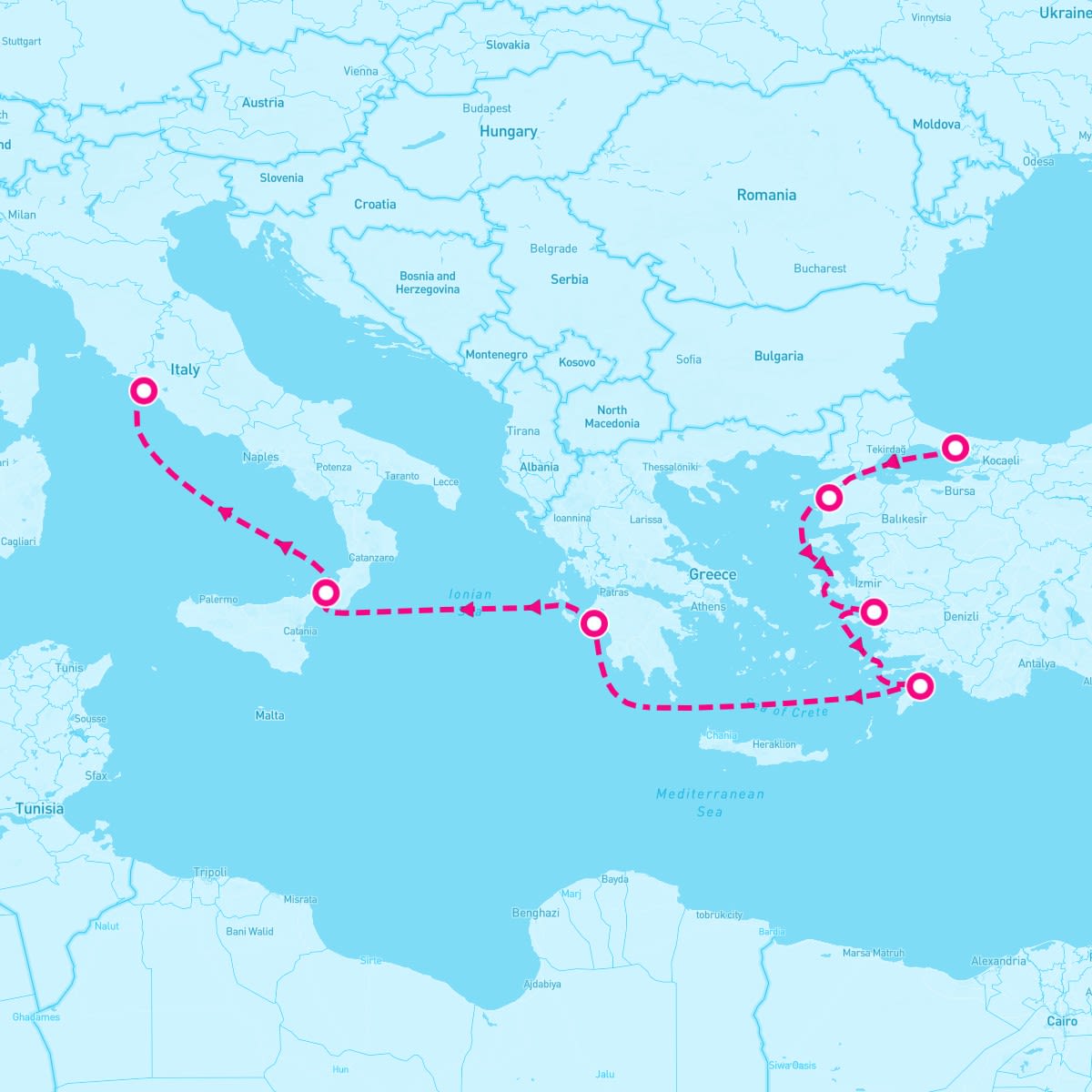 This route includes istanbul-turkey, cruise-dardanelles, kusadasi-turkey, rhodes-greece, olympia-greece, cruise-strait-of-messina, rome-italy.