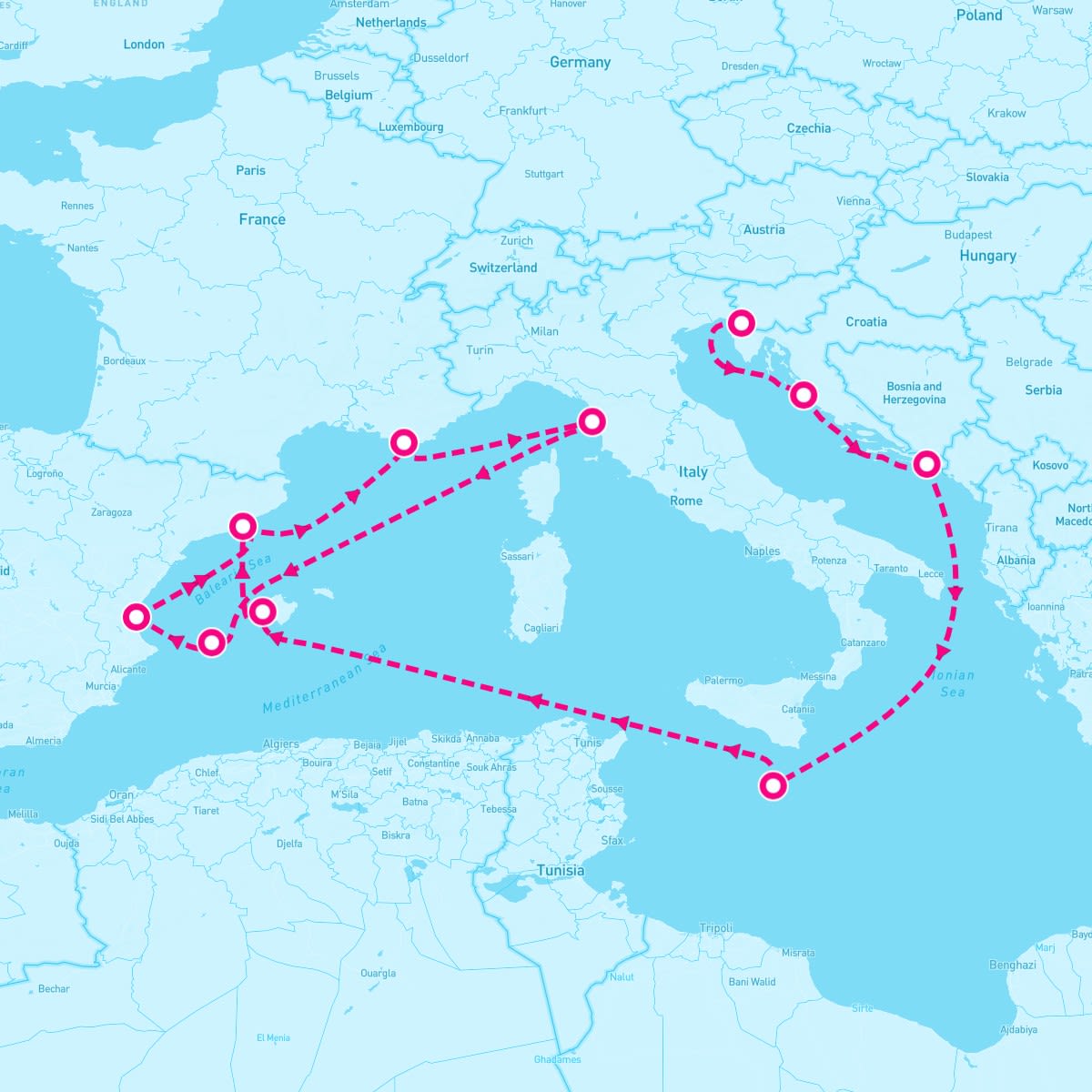 This route includes trieste-italy, zadar-croatia, dubrovnik-croatia, valletta-malta, palma-de-mallorca-spain, barcelona-spain, toulon-france, livorno-florence-italy, ibiza-balearic-islands, valencia-spain.