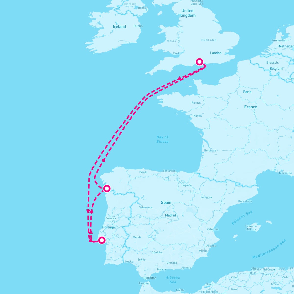 This route includes southampton-england, lisbon-portugal, vigo-spain.