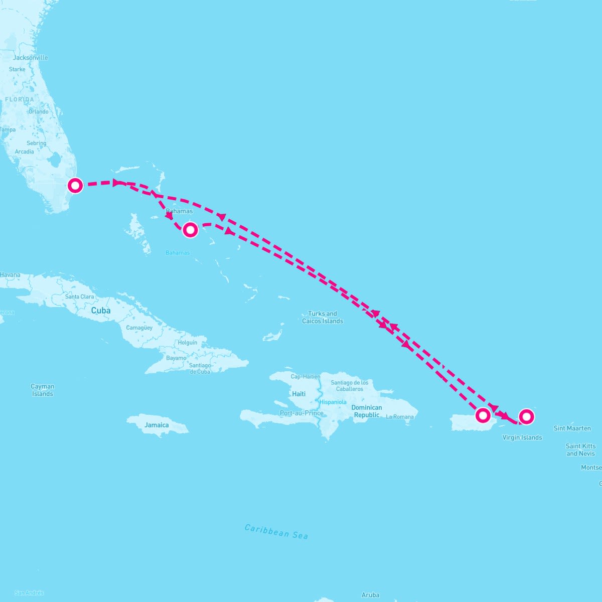 This route includes fort-lauderdale-florida, lighthouse-point-eleuthera-disney-destination, san-juan-puerto-rico, tortola-british-virgin-islands.