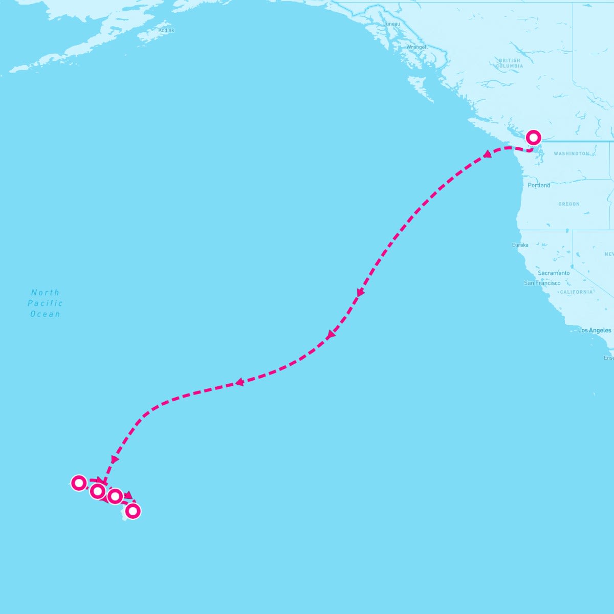 This route includes vancouver-british-columbia, honolulu-oahu, nawiliwili-kauai, kahului-maui-hawaii, hilo-hawaii.