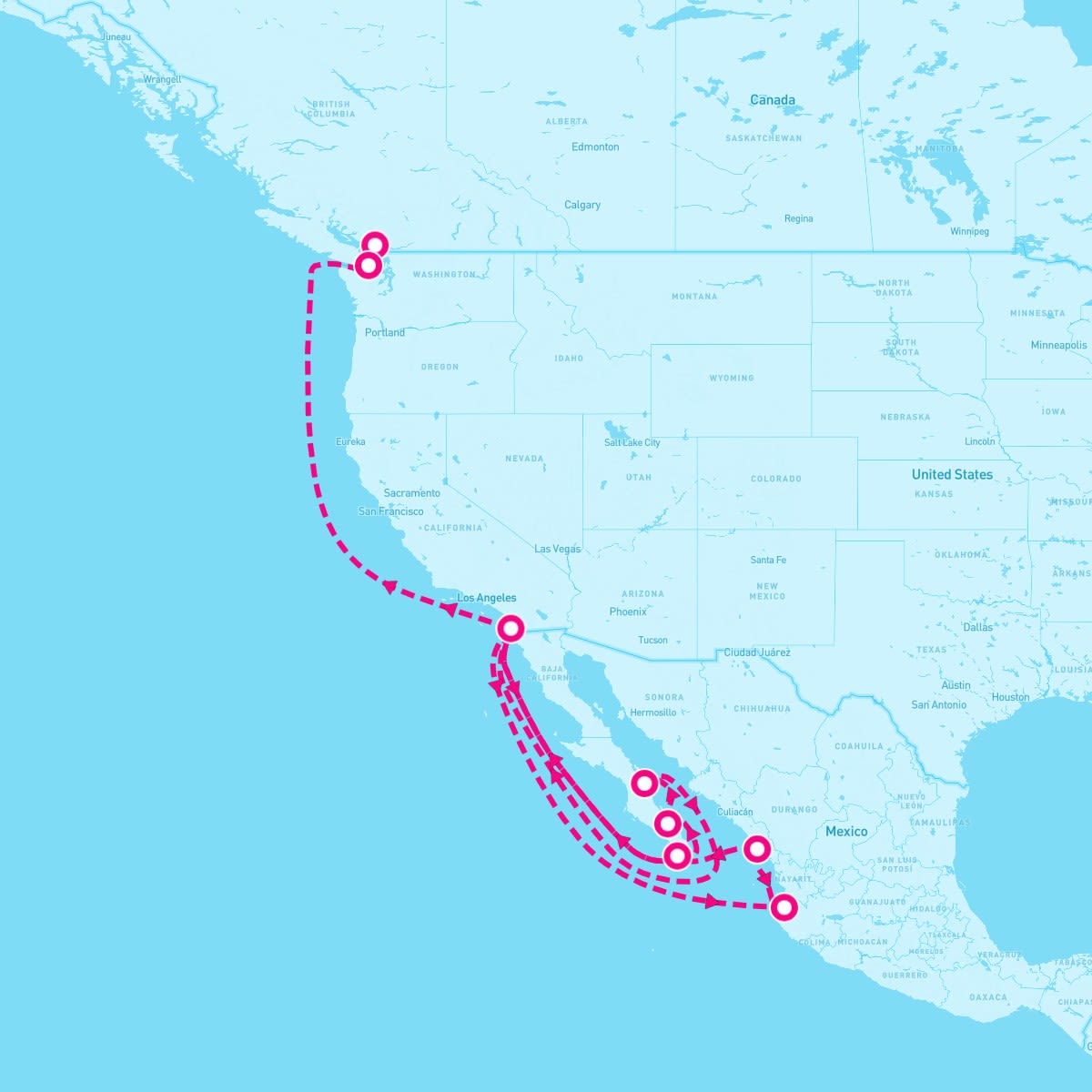 This route includes san-diego-california, cabo-san-lucas-mexico, pichilingue-la-paz-mexico, loreto-mexico, mazatlan-mexico, puerto-vallarta-mexico, victoria-british-columbia, vancouver-british-columbia.