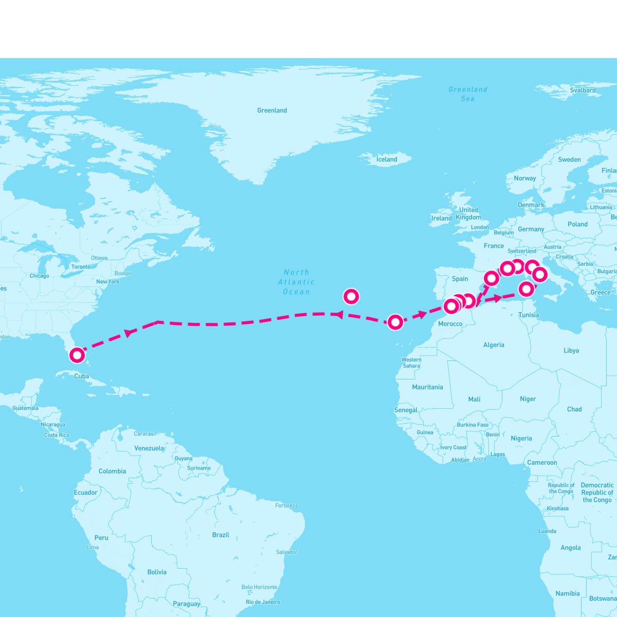 This route includes fort-lauderdale-florida, ponta-delgada-azores, funchal-madeira, ceuta-spanish-morocco-north-africa, barcelona-spain, malaga-spain, cruise-strait-of-gibraltar, tangier-morocco, almeria-spain, cagliari-sardinia, rome-italy, livorno-florence-italy, villefranche-sur-mer-france, marseille-france.