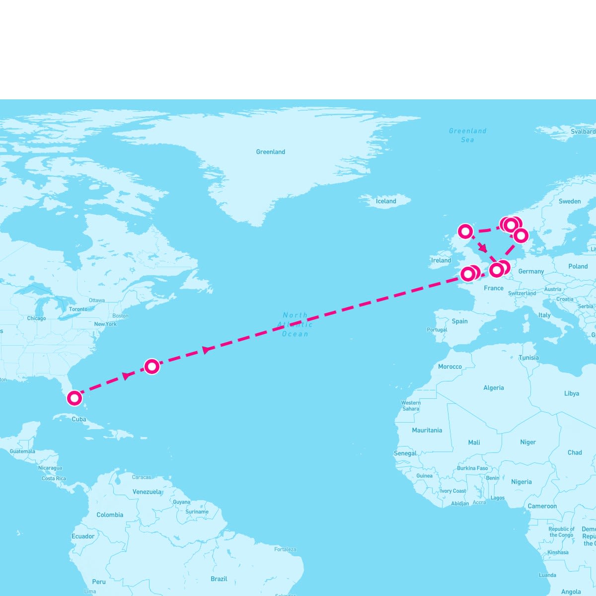 Cruise Itinerary Map - 21 Night Norwegian Fjords Crossing: Scotland London & Brugge (Ft. Lauderdale To Rotterdam)