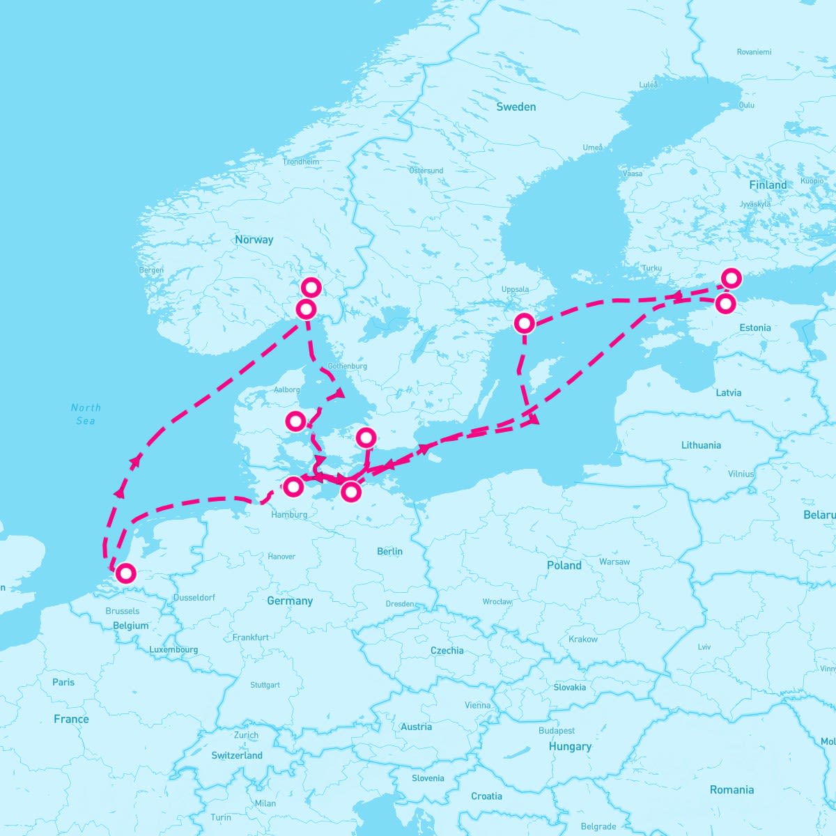 This route includes rotterdam-netherlands, oslo-norway, cruise-oslofjord, arhus-denmark, warnemunde-germany, tallinn-estonia, helsinki-finland, stockholm-sweden, kiel-germany, copenhagen-denmark.