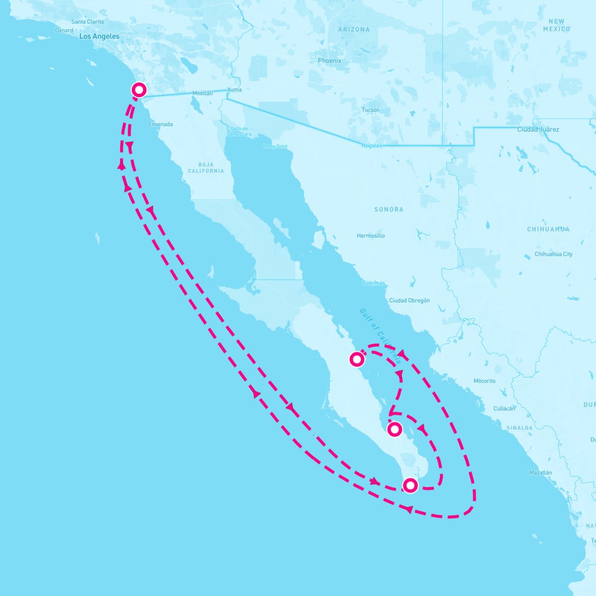 This route includes san-diego-california, pichilingue-la-paz-mexico, loreto-mexico, cabo-san-lucas-mexico.