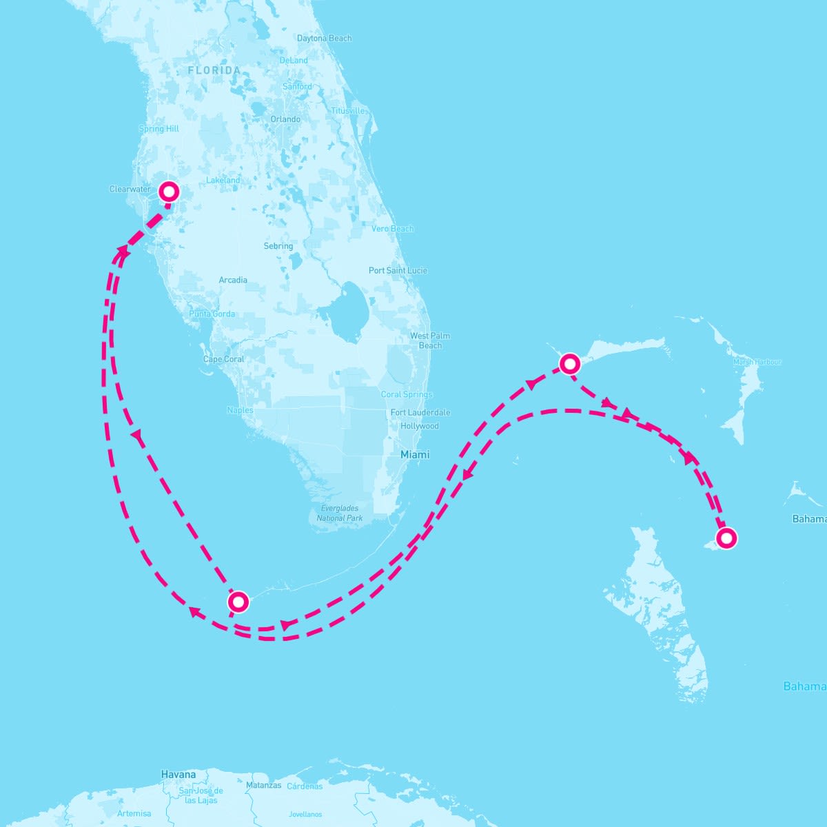 This route includes tampa-florida, key-west-florida, freeport-bahamas, nassau-bahamas.