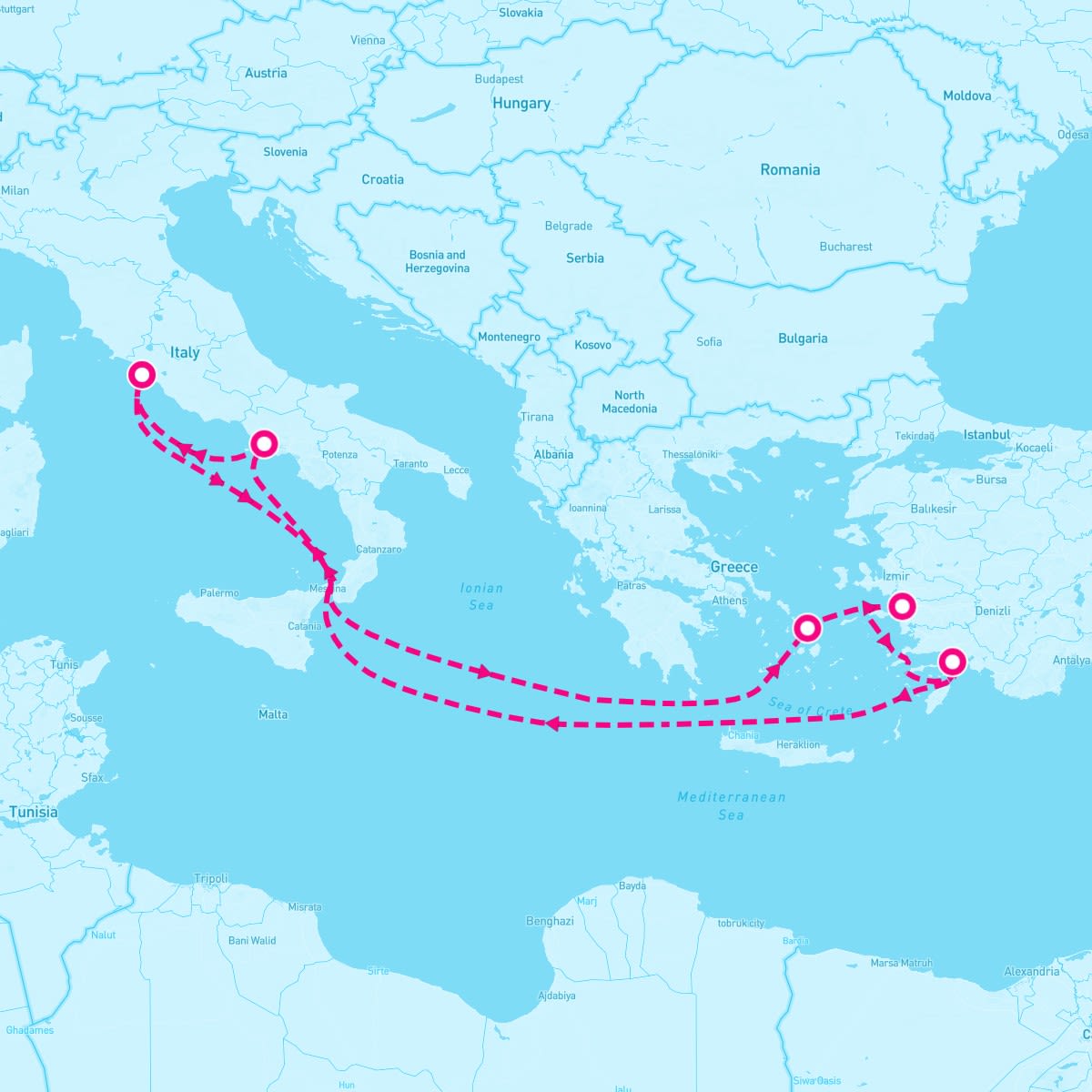 This route includes kusadasi-turkey, marmaris-turkey, naples-italy, rome-italy, mykonos-greece.