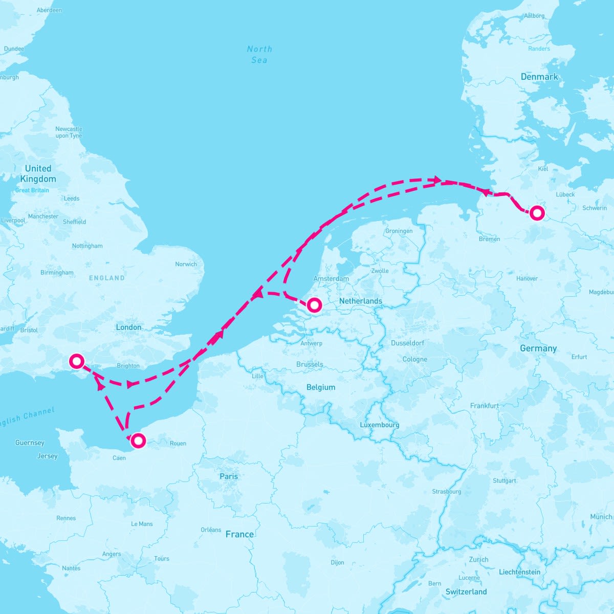 This route includes southampton-england, hamburg-germany, rotterdam-netherlands, le-havre-france.