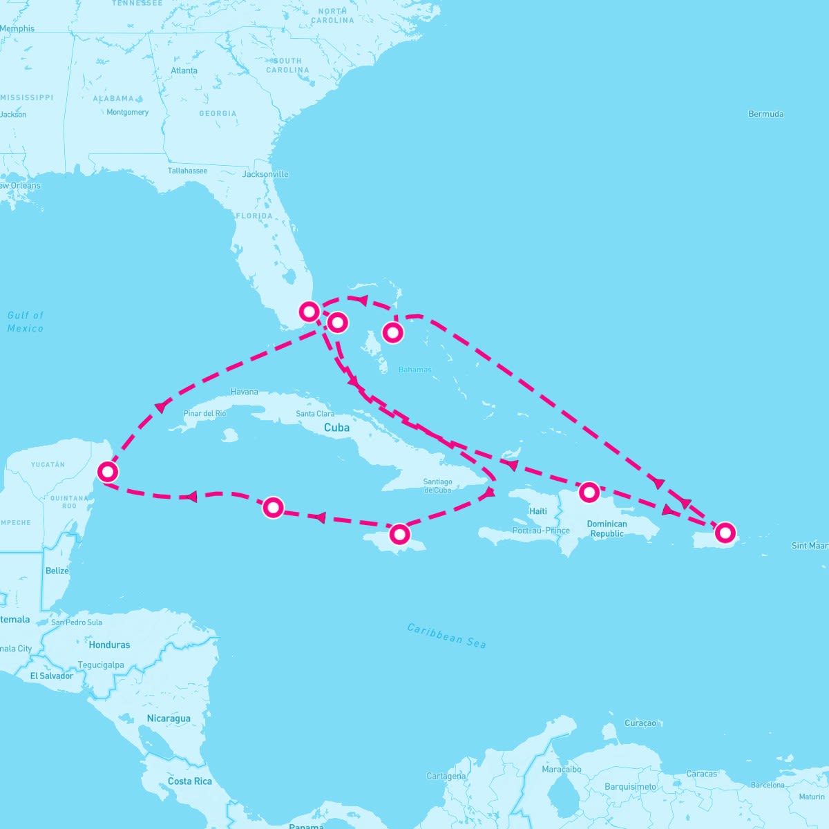 This route includes miami-florida, ocho-rios-jamaica, george-town-grand-cayman, cozumel-mexico, ocean-cay-msc-marine-reserve-bahamas, nassau-bahamas, san-juan-puerto-rico, puerto-plata-dominican-republic.