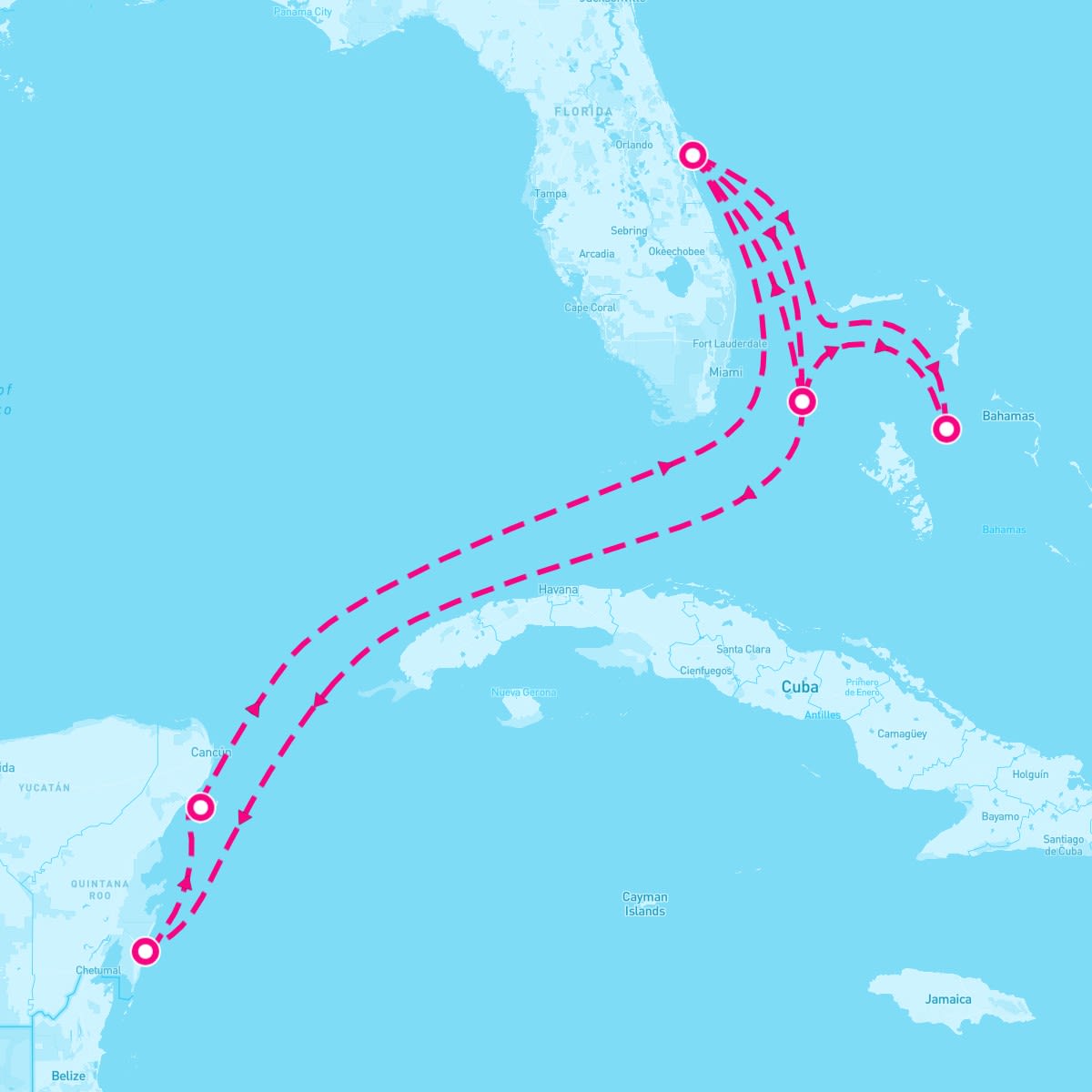 This route includes port-canaveral-florida, ocean-cay-msc-marine-reserve-bahamas, costa-maya-mexico, cozumel-mexico, nassau-bahamas.