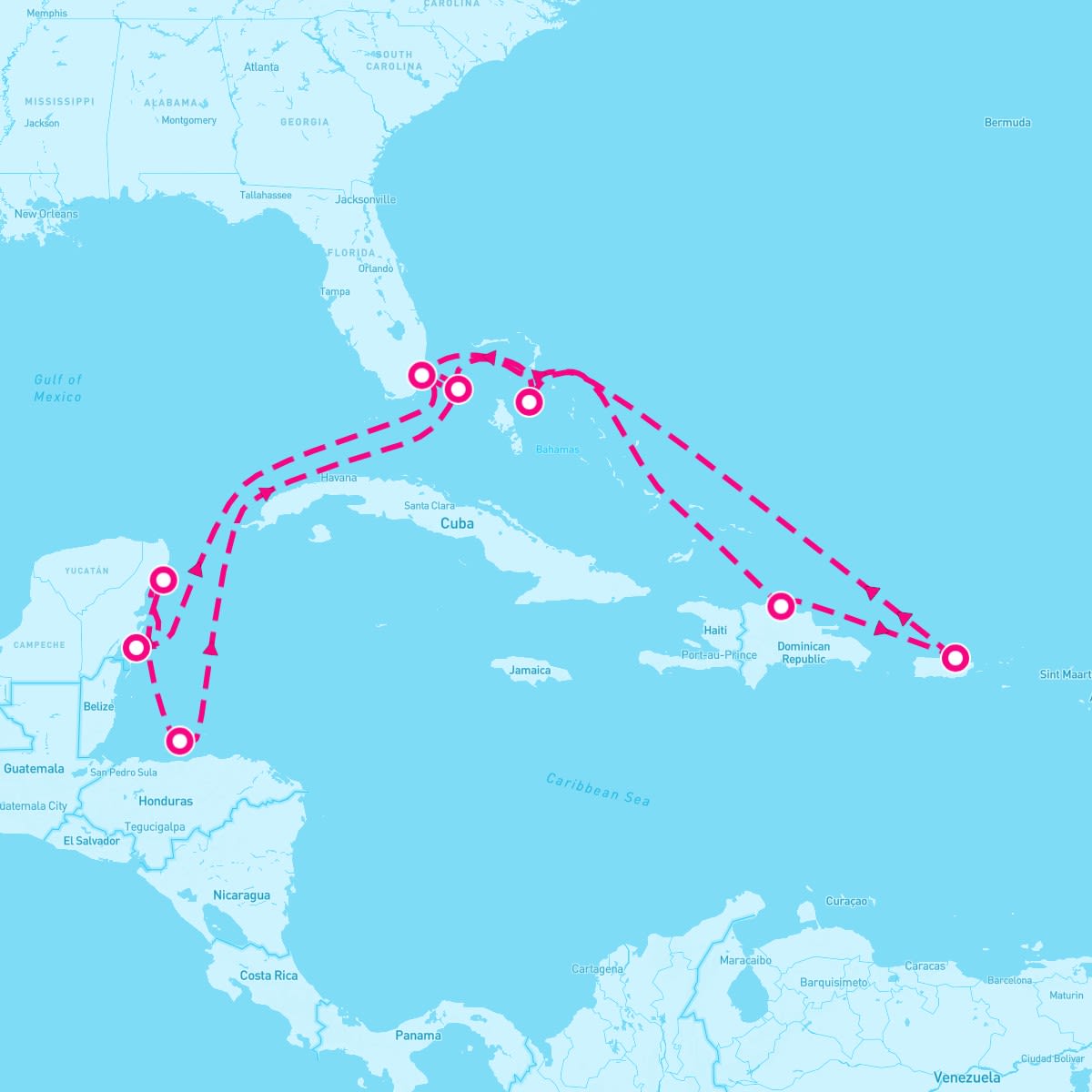This route includes miami-florida, ocean-cay-msc-marine-reserve-bahamas, puerto-plata-dominican-republic, san-juan-puerto-rico, nassau-bahamas, costa-maya-mexico, cozumel-mexico, roatan-bay-honduras.