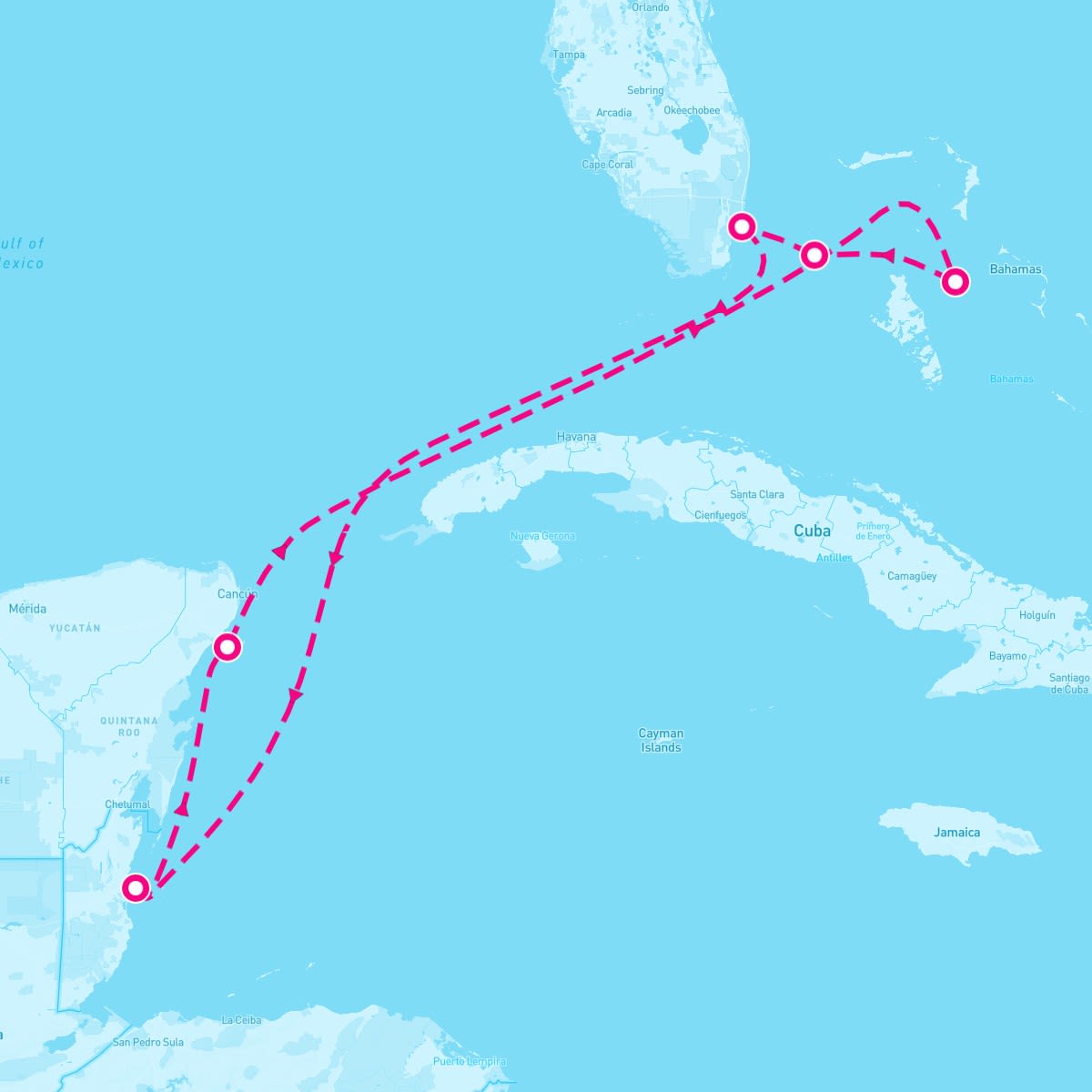 This route includes miami-florida, belize-city-belize, cozumel-mexico, nassau-bahamas, ocean-cay-msc-marine-reserve-bahamas.