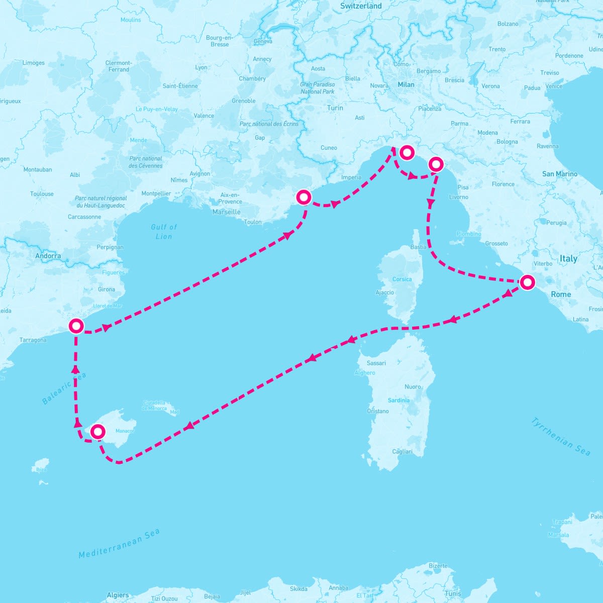 This route includes rome-italy, palma-de-mallorca-spain, barcelona-spain, cannes-france, genoa-portofino-italy, la-spezia-italy.